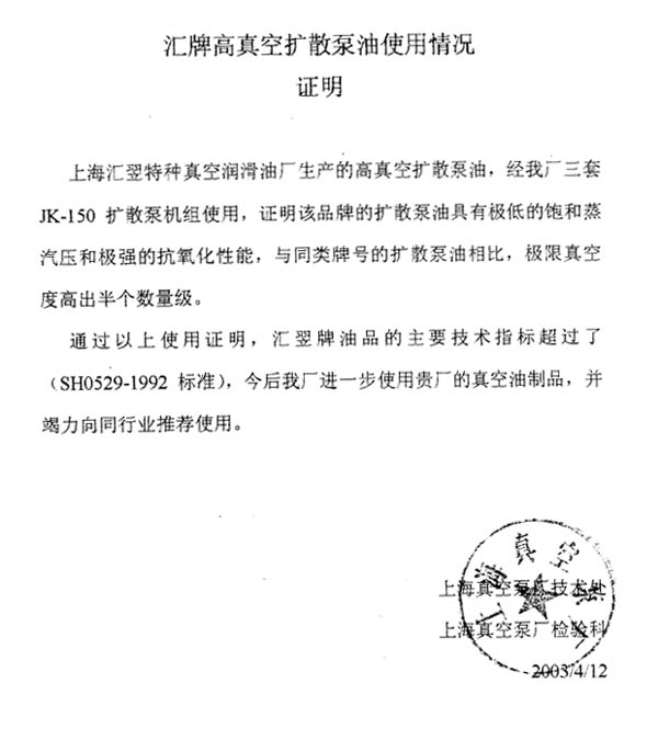 汇牌高真空扩散泵油使用情况证明